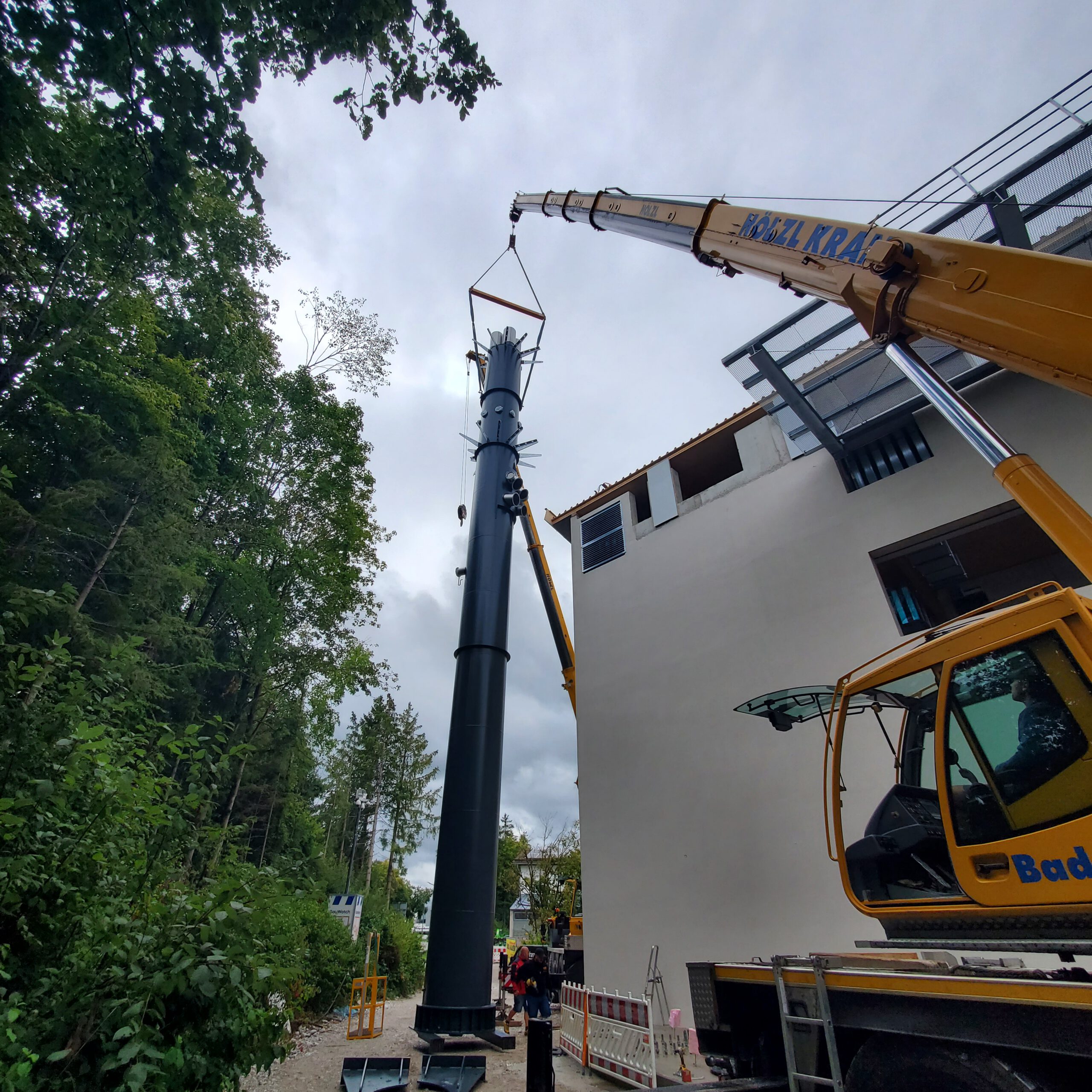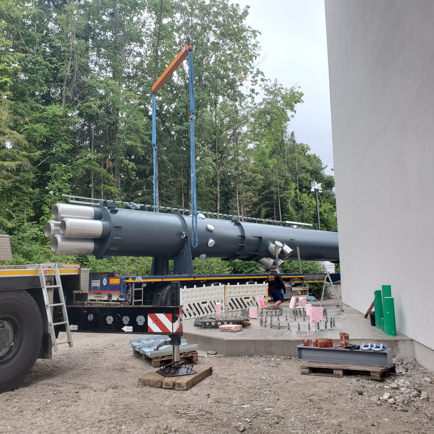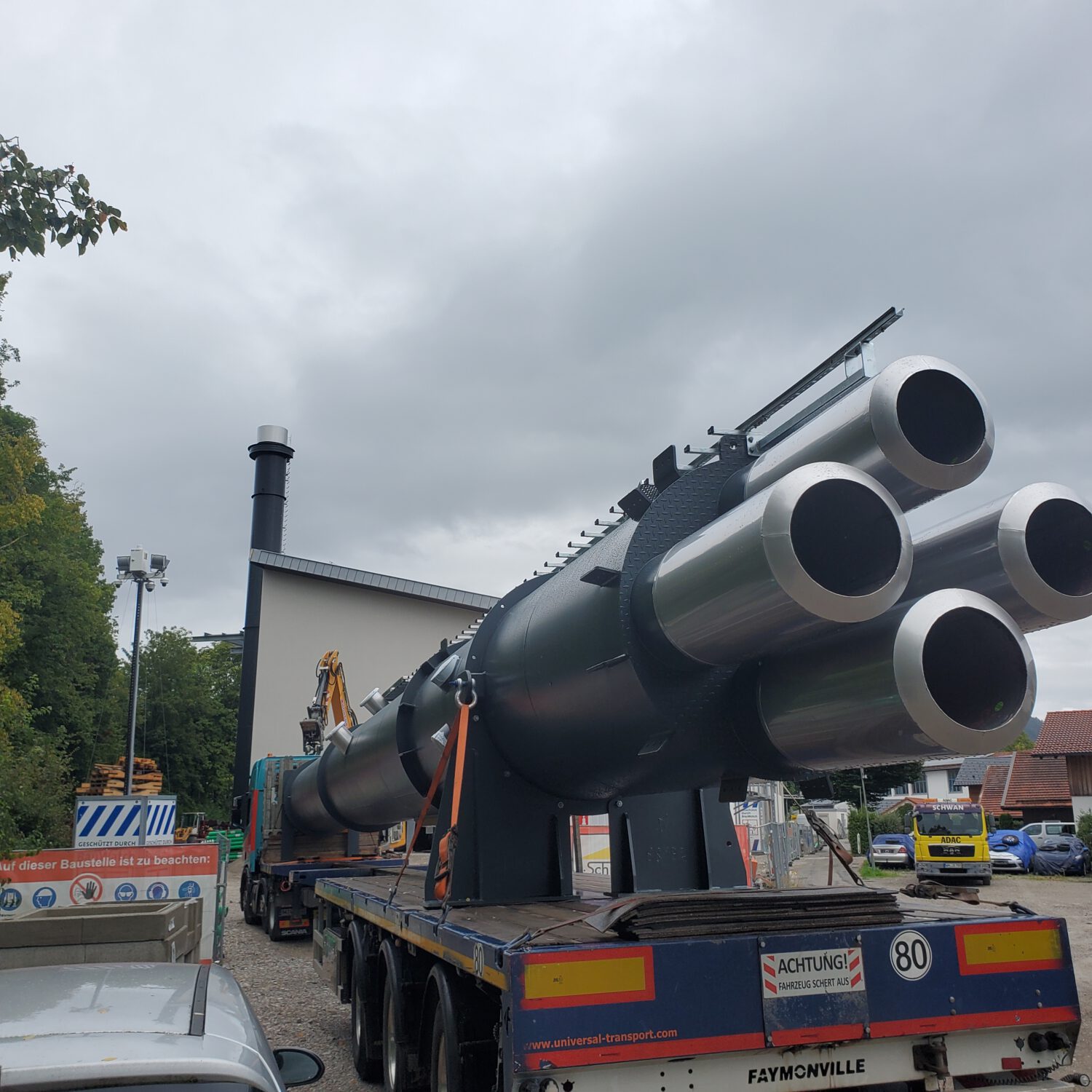 Ein großer Moment für alle Planer und Baufirmen war im März die Anlieferung der vier großen Pufferspeicher á ca. 150 m³, die mit einem Autokran eingehoben wurden. Diese Behälter für Warmwasser dienen der zeitlichen Entkopplung der Wärme-Erzeugung durch Wärmetauscher, PV-Strom sowie Hackschnitzel mit der Nutzung der benötigten Fernwärme für die Tölzer Haushalte. So wird die Energie, die Mittags beispielsweise durch Sonnenenergie im Überfluss entsteht, abends und nachts passgenau abgerufen.