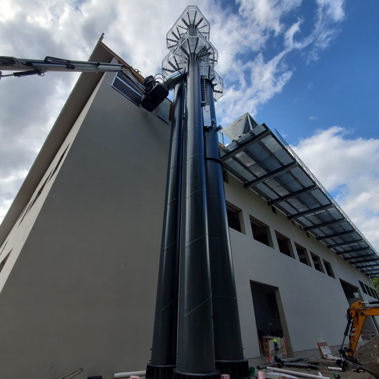 „Insgesamt arbeiten über 50 unterschiedliche Gewerke und Planungsbüros am Bau der WEZ – und bislang läuft alles planmäßig. Die Dacheindeckung ist abgeschlossen, die Photovoltaikanlage und die Luftwärmepumpen sind bereits montiert. Auch die Kessel für Hackschnitzel und Gas sowie vier große Pufferspeicher stehen schon und sind einsatzbereit – der Testbetrieb läuft. Vier große Kamine mit speziellen Filtern sorgen dafür, dass die Emissionswerte beim Feinstaub bei 0 liegen. Derzeit liegt unser Schwerpunkt auf dem Rohr- und Anlagenbau im Gebäude. Bei den Außenanlagen wird vor dem Winter intensiv an der Entwässerung und der Oberflächenbefestigung gearbeitet. Wir rechnen damit, dass einzelne Komponenten noch in diesem Jahr in Regelbetrieb gehen – weitere Anlagen folgen dann 2026.“